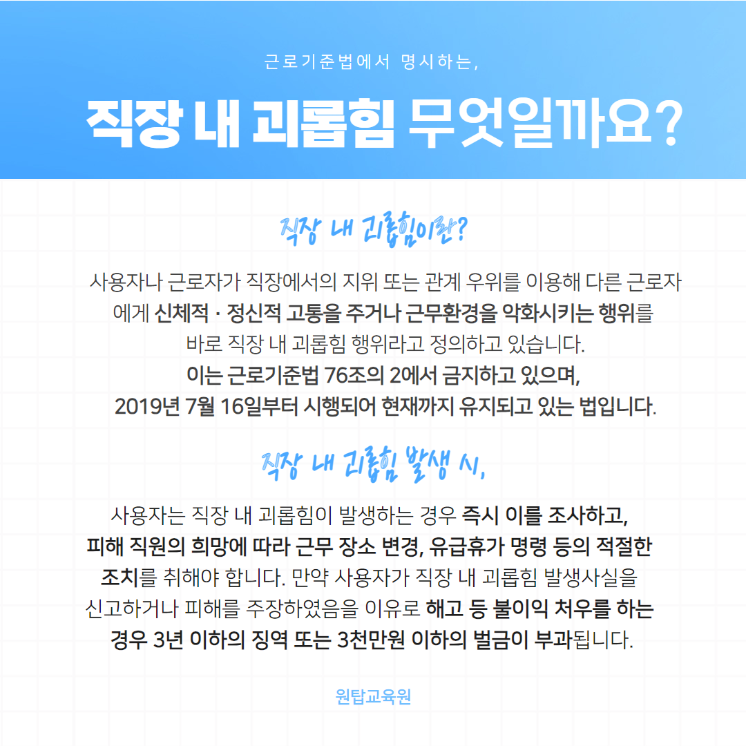 이는 2019년 7월 16일부터 시행되어 근로기준법 제76조의 2에서 직장 내 괴롭힘을 금지하고 있습니다.