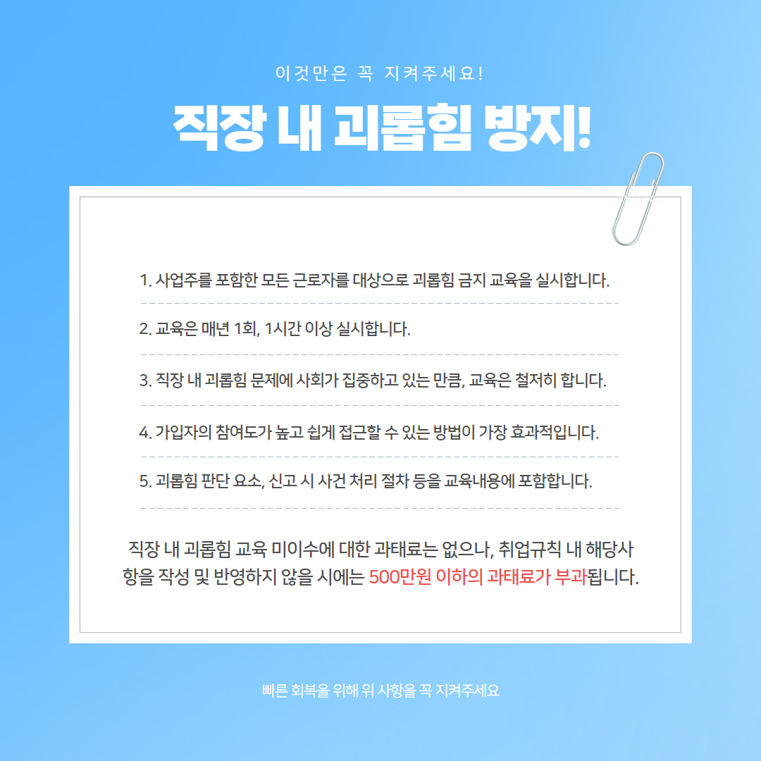 취업규칙 내 직장 내 괴롭힘에 관한 사항을 적용하지 않을 시에는 500만원 이하의 과태료가 부과됩니다.