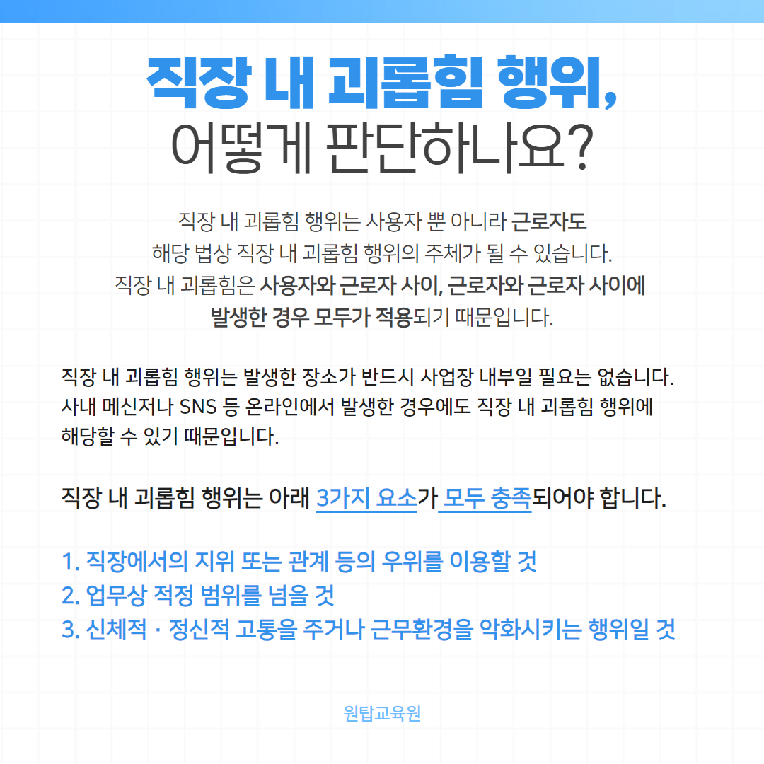 직장 내 괴롭힘 행위는 아래 3가지 요소가 모두 충족되어야 합니다.